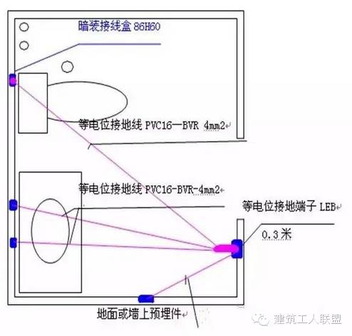 24、卫生间内作等电位连接,局部应与等电位端子箱LEB中的端子连接。卫生间在距地0.3m设一等电位端子箱,至金属管道、金属器具接地线采用PVC16管内穿BVR-4㎟铜线(黄绿双色)可靠联接,每根联接线均由等电位端子箱单独接出,接地线联接后,墙面引出管口、接线盒及时封堵或封盖。