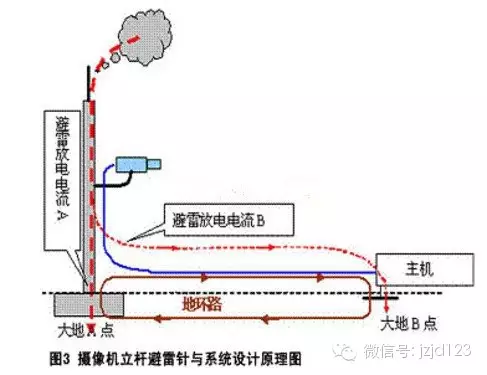 摄像机立杆避雷针化,就是指立杆按照避雷针设计,并强调摄像机外壳必须与金属立杆等电位连接。我们来分析防直击雷的“摄像机立杆避雷针化”,对安防系统的影响,其设计原理如图3所示。