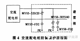 MYS8-FD2串联组合体;火线与零线间安装过电压保护器MYS5-320/20与MYS5-FD2串联组合体。此防雷器件全部安装于防雨防尘的避雷箱内,固定在架空线杆上,距架空线接地处越近越好,避雷箱距逆变器的输出端应大于10m。交流配电柜防雷保护原理如图4所示。