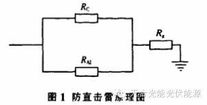 防直击雷原理如图1所示,其中:RAI为电池方阵铝框架电阻,RAI=0;RC为电池方阵电阻,RC≥100MΩ;Rg为接地电阻,Rg≤10Ω。